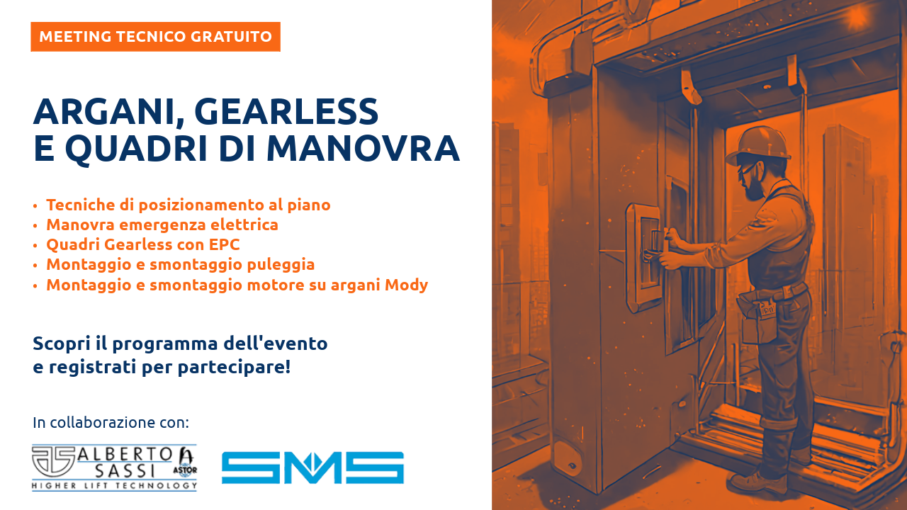 Organizzato in collaborazione con Alberto Sassi e SMS approfondiremo il loro catalogo prodotti con focus su: argani, gearless e quadri di manovra e non solo!